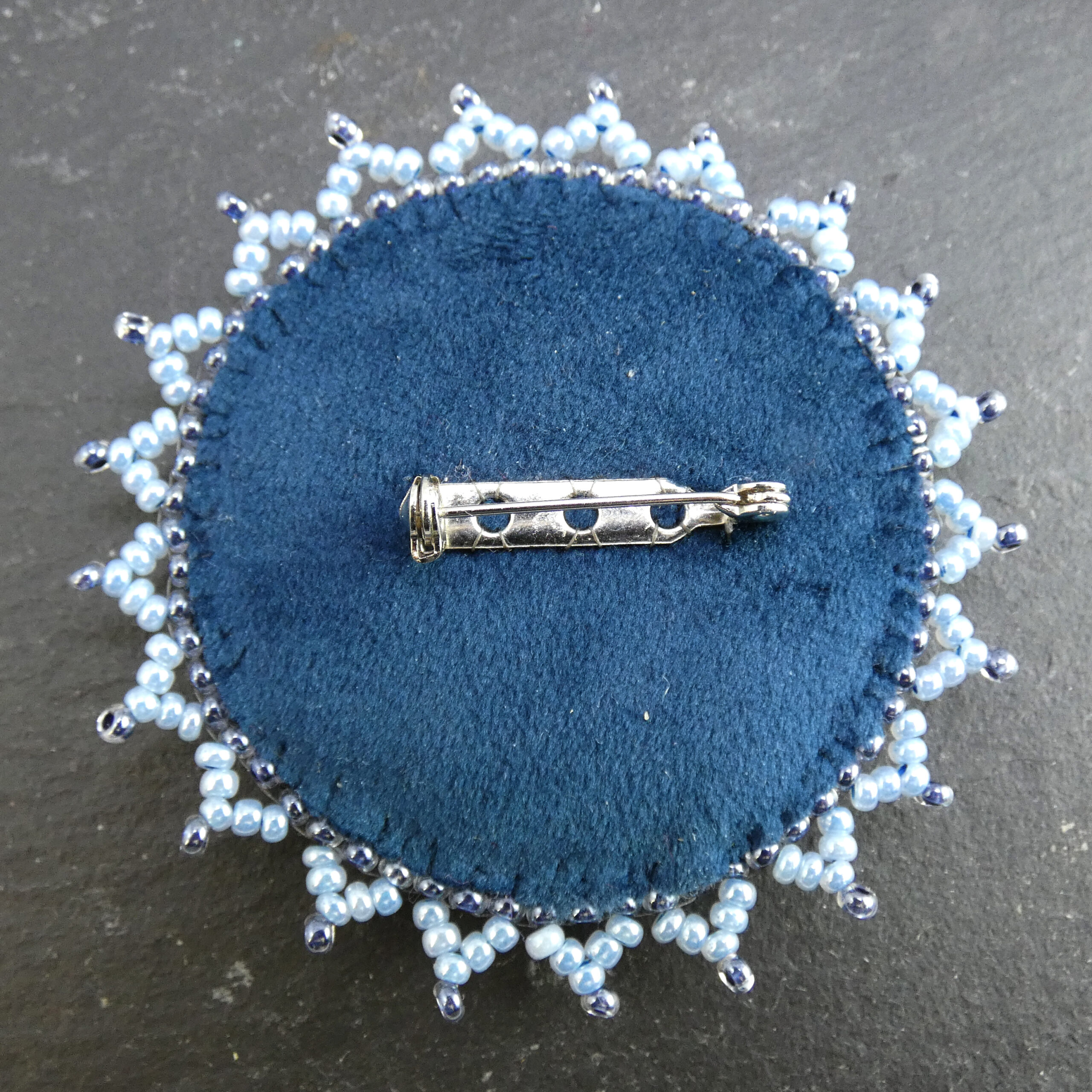 Materials: Nylon thread, glass beads, polyester backing fabric, plastic cabochon, and a pin badge back.