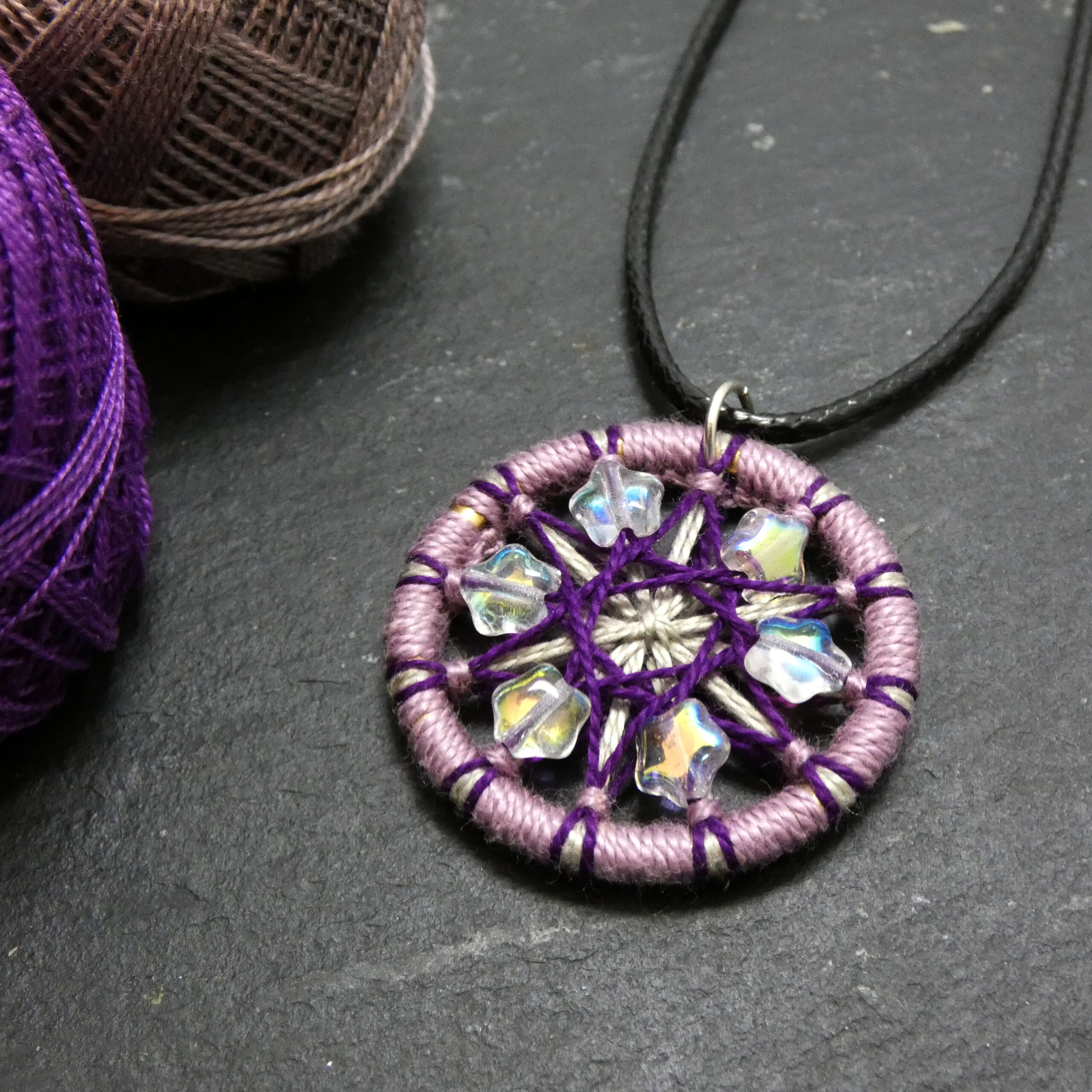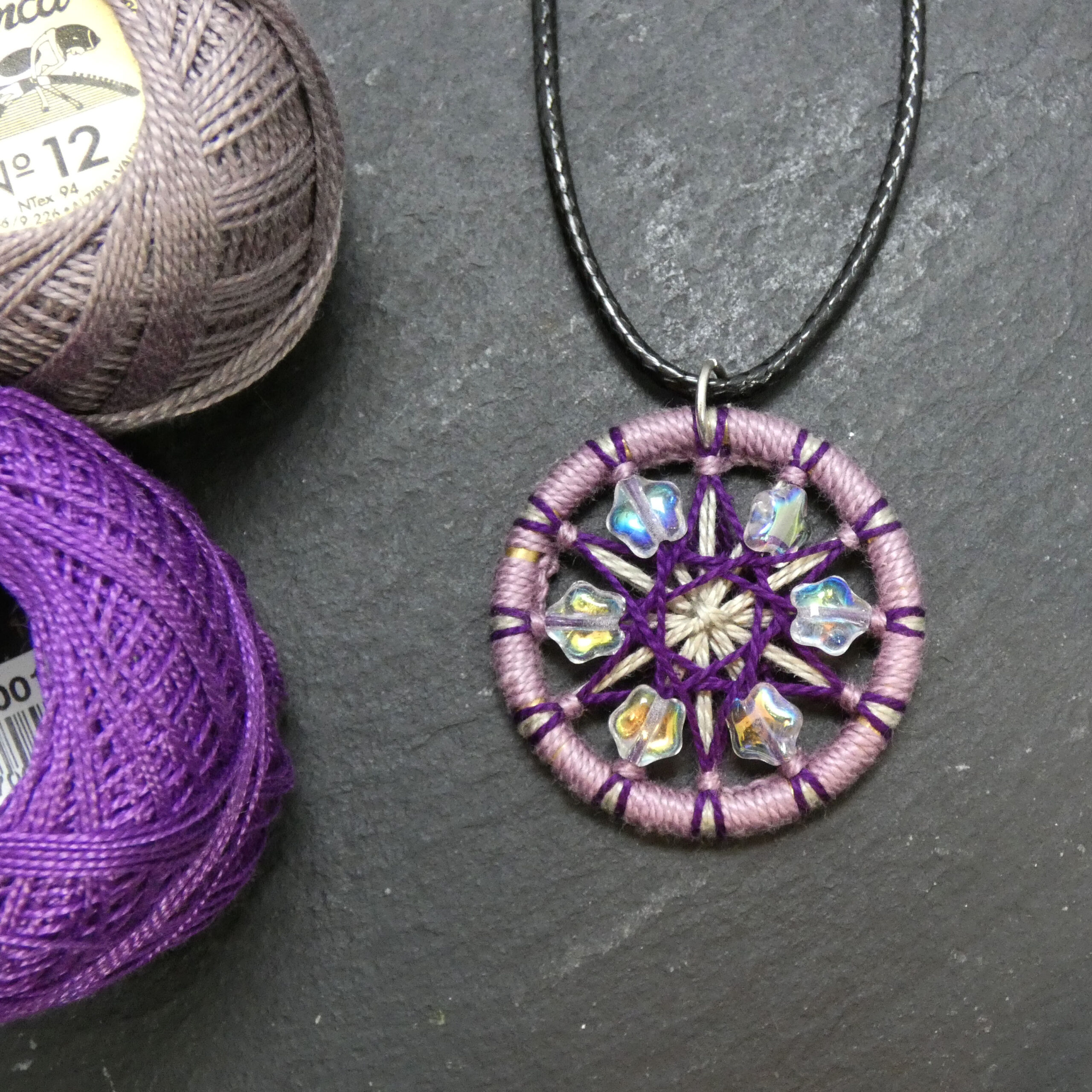 Materials: Repurposed curtain ring, cotton thread, glass beads, metal pendant finding, waxed cord.