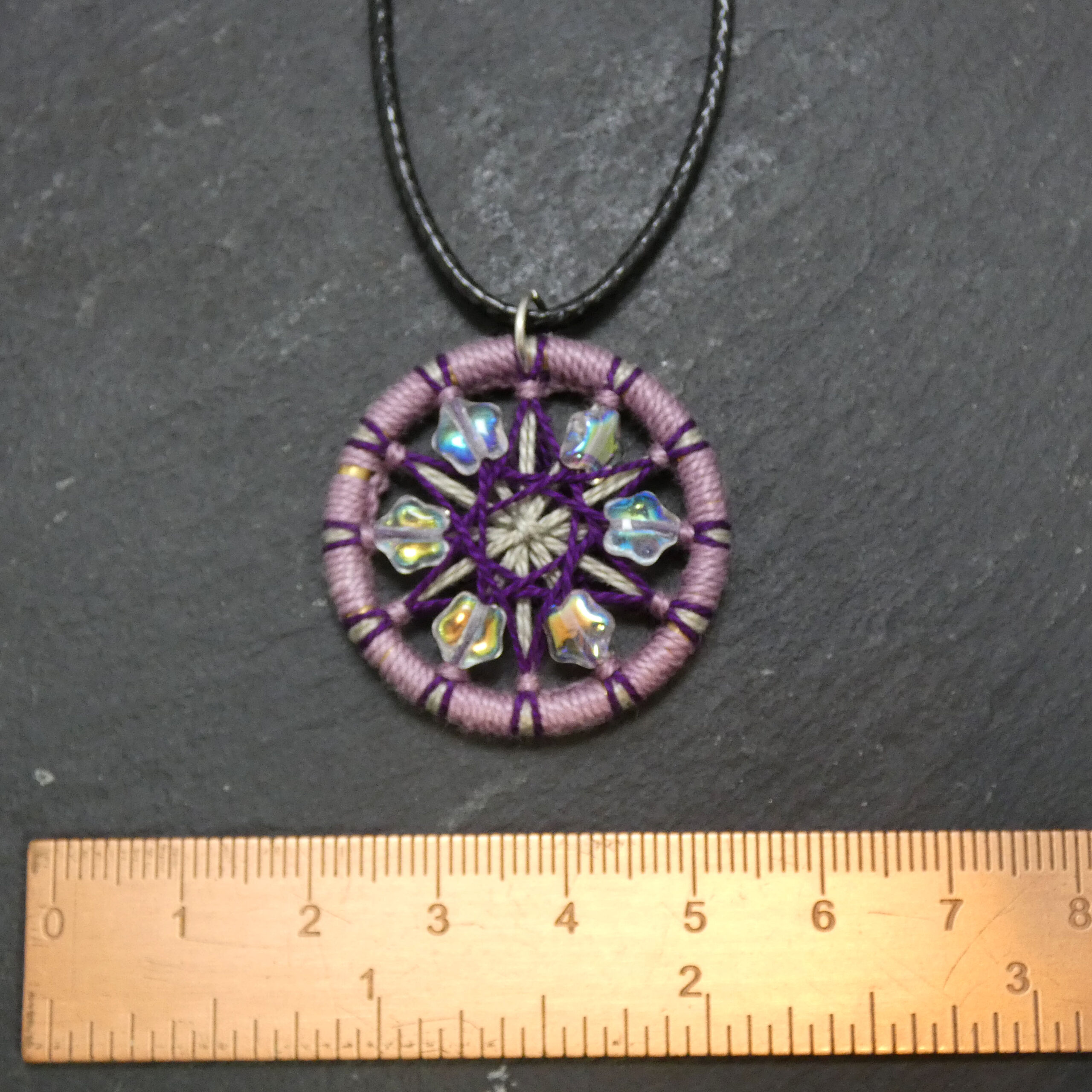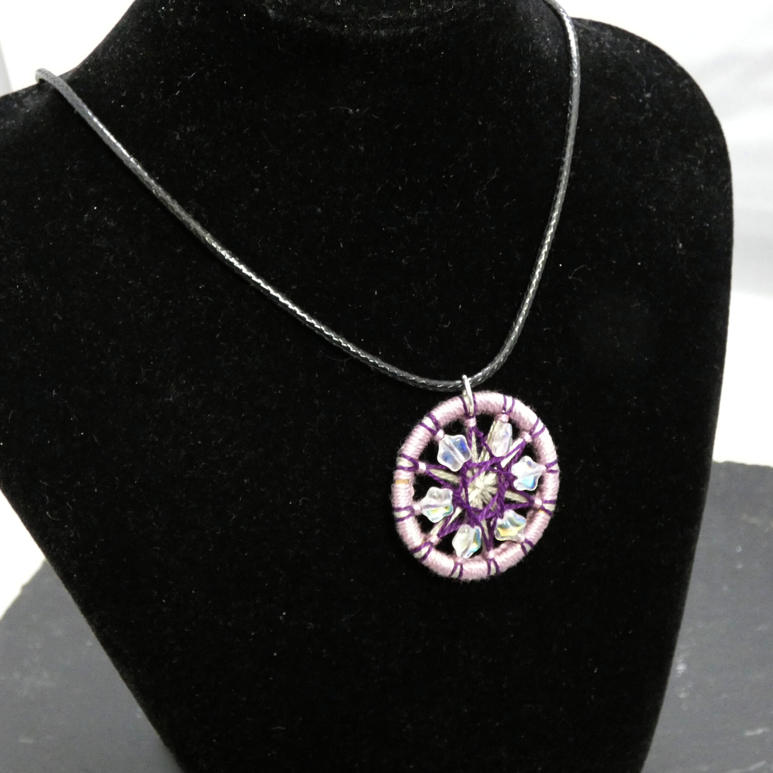 The alternating pattern of beads and threadwork on this pendant could symbolise an arcane sigil, or a fractured heart.